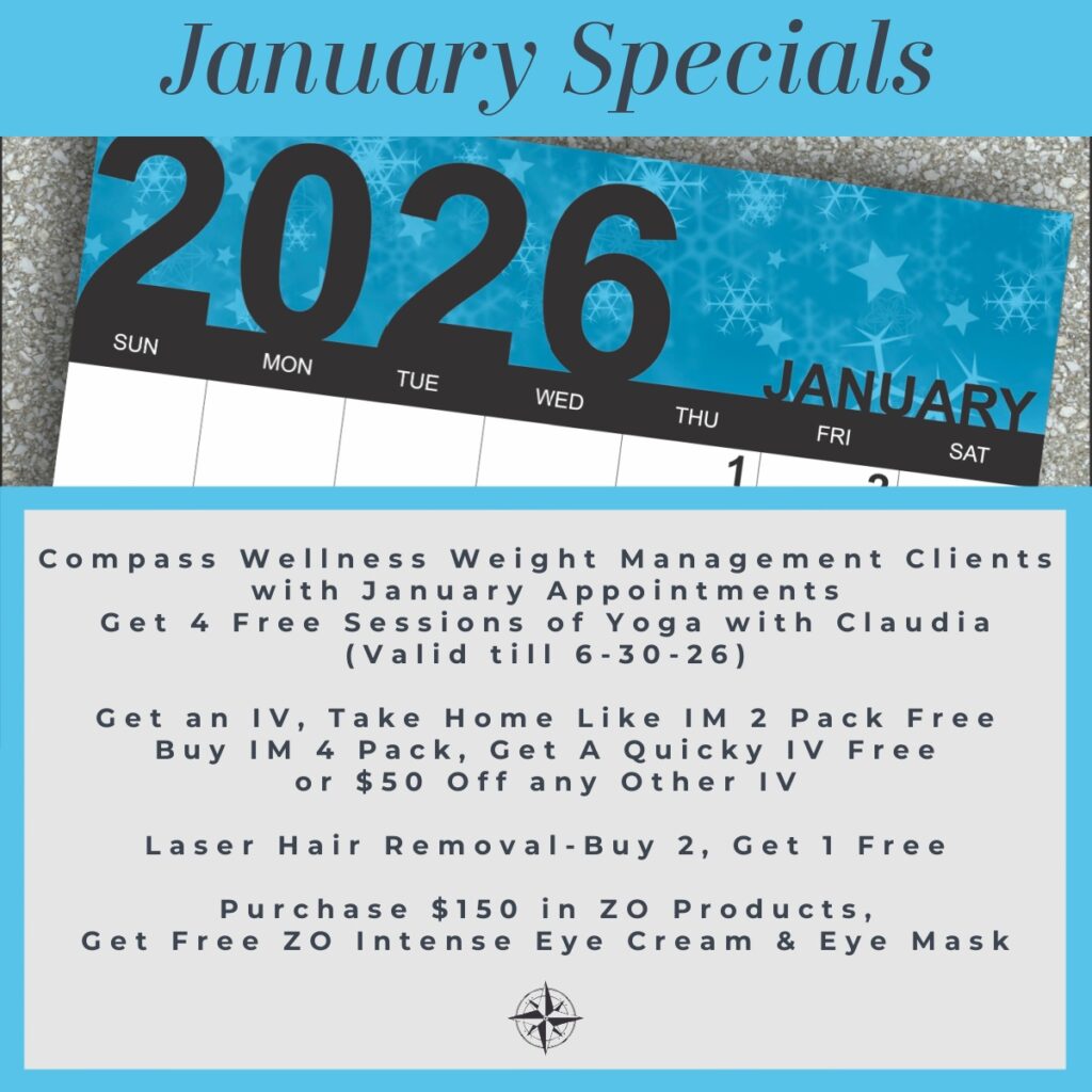 Movement is a key part of sustainable weight management. As part of our commitment to supporting your overall wellness journey, Compass Wellness Weight Management clients can enjoy four complimentary yoga sessions with Claudia. These classes focus on flexibility, strength, stress reduction, and mindful movement—perfect for supporting both physical and mental well-being long after January ends.